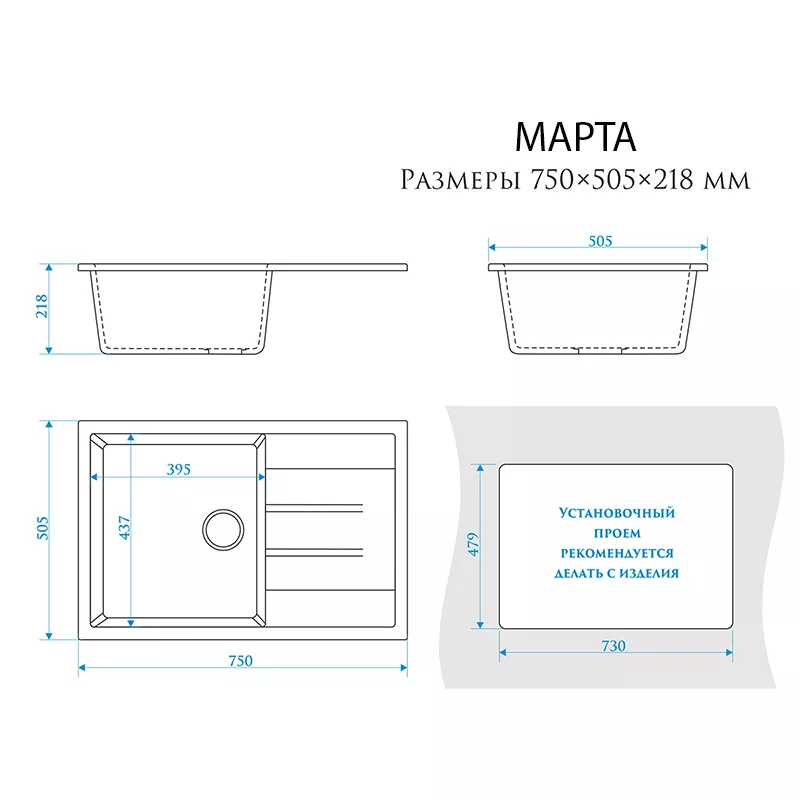 | Тип мойки: Прямоугольная, Материал: Гранит, Цвет: Тёмно-серый, Покрытие: Матовое, Ширина мойки: 750 мм, Глубина мойки: 505 мм, Глубина чаши: 218 мм, Количество чаш: 1, Размер чаши: 437×395 мм, Размер установочного выреза: 730×479 мм, Сифон: С переливом, Перелив: В чаше, Комплектация: Герметик, Паспорт, Сливная арматура | — |