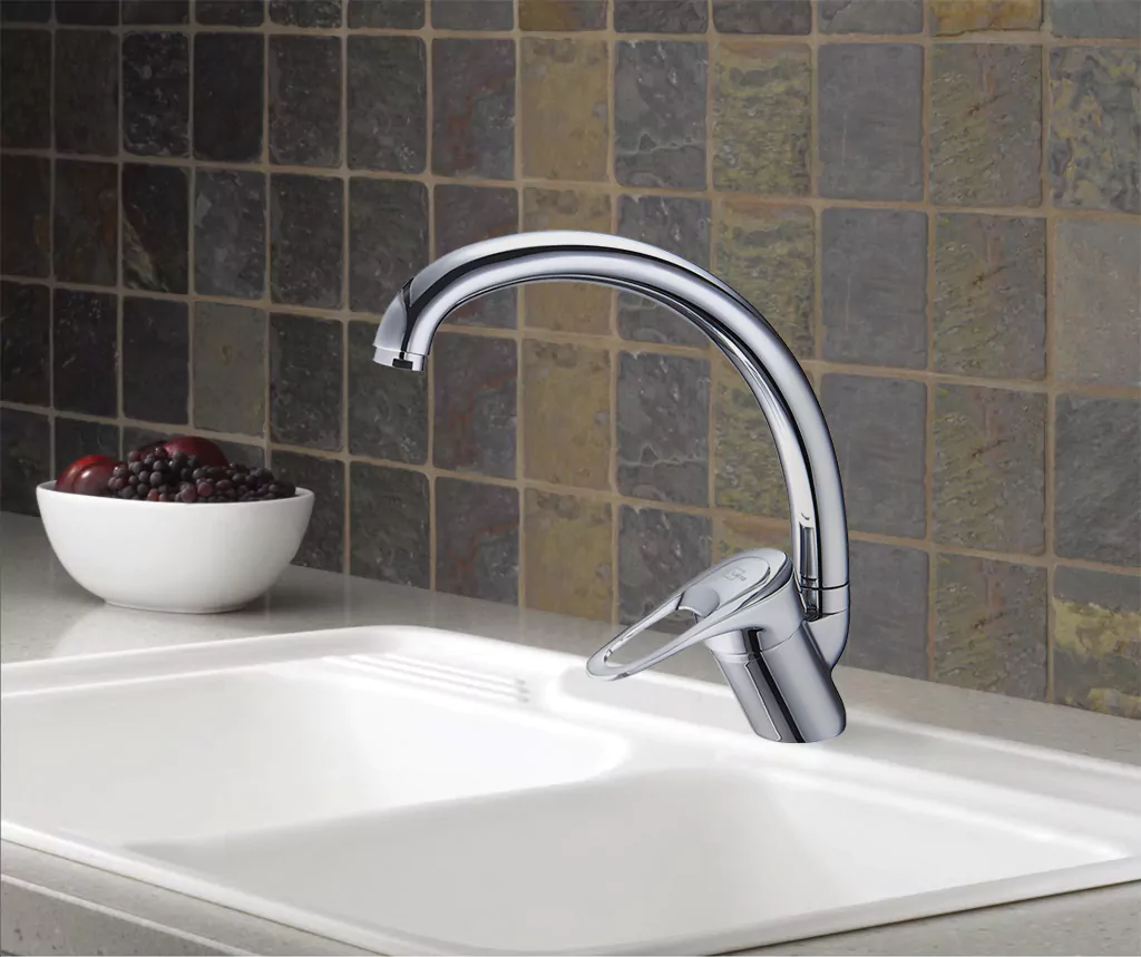 Однорычажный кухонный смеситель, отлитый под давлением. Керамический картридж работает бесшумно и долго.