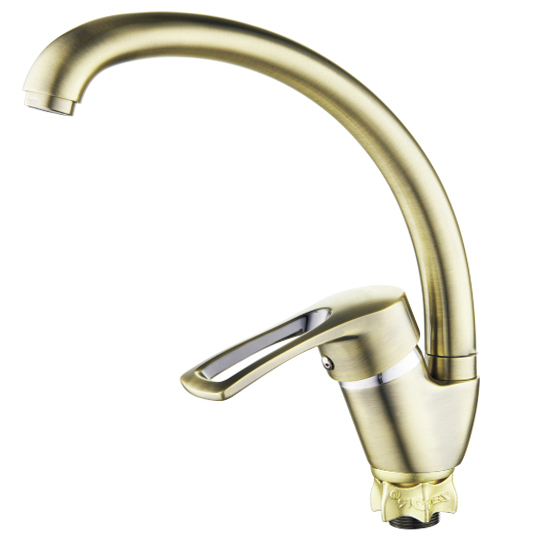 Однорычажный кухонный смеситель в цвете бронзы. Подходит для интерьеров в классическом или ретро-стиле.